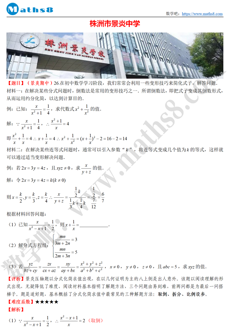 看了一下景炎、建宁、二中附中的期中试卷,特别有意思。景炎这次期中压轴题是一道分式求值题,披上阅读理解的外衣,该题就变的合理合法,难度也降下来了。建宁、二中附中这次命题老师估计商量好了,最后一道压轴题一模一样,而这道压轴题是建宁去年第三次月考的压轴题原题,我也曾写过一篇文章评论该题,难不成评一下,就成了“网红题”。